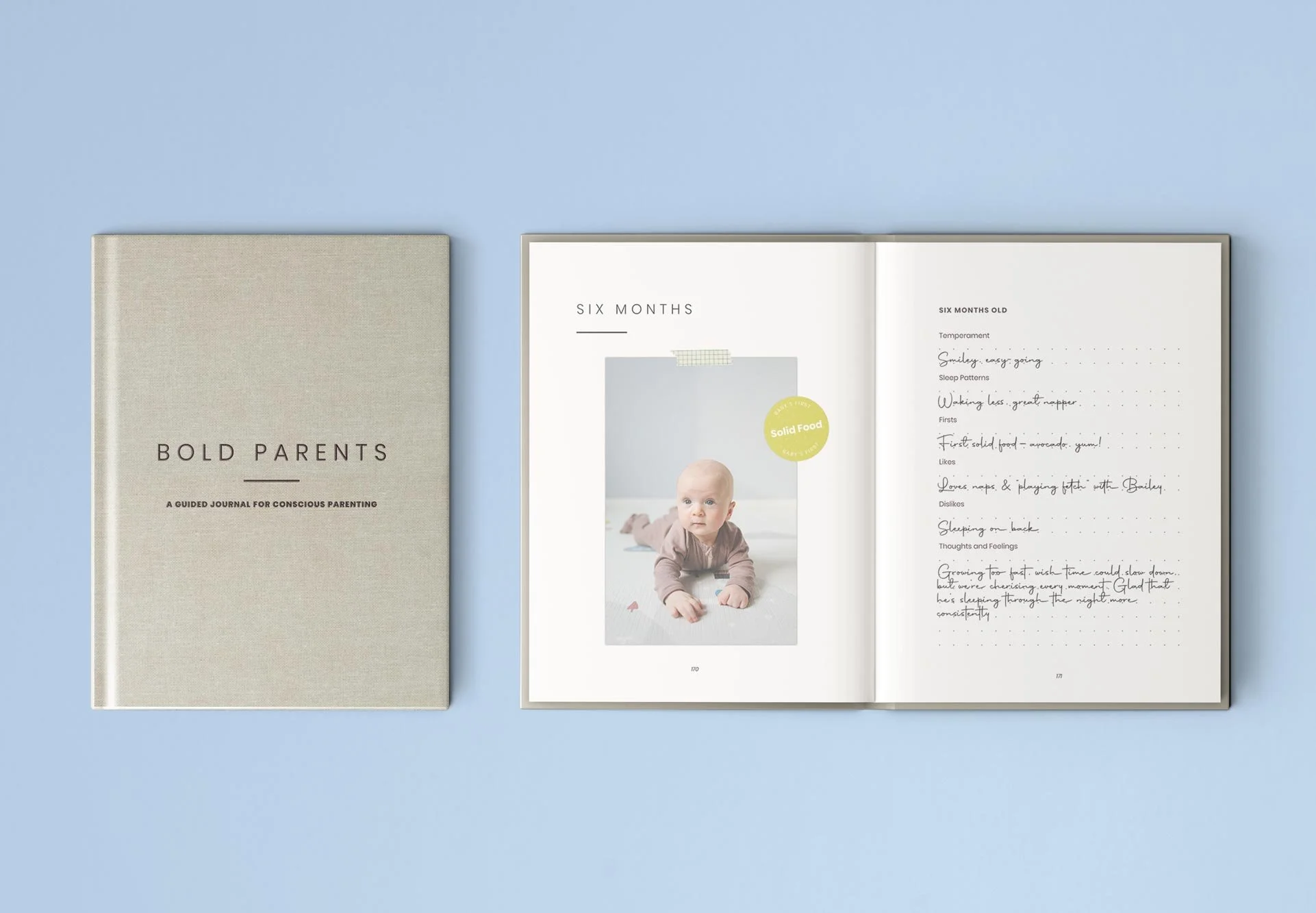 Bold Parents is a product of Bold Font Coaching for new and expectant parents. We wanted the design of this 193-page guided journal to feel elevated with its linen hardcover with foil stamping and thread-sewn, flat-lay binding.